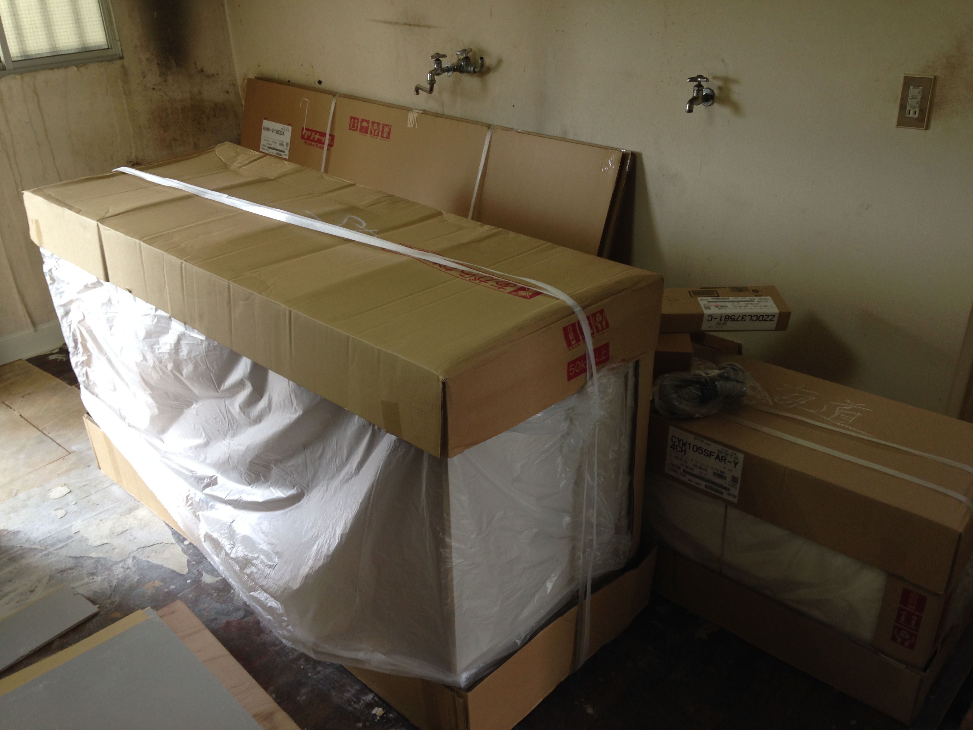 なんとか4人がかりでキッチン設備一式を物件に搬入し終えることができました(私はほとんど何もしませんでしたが)
