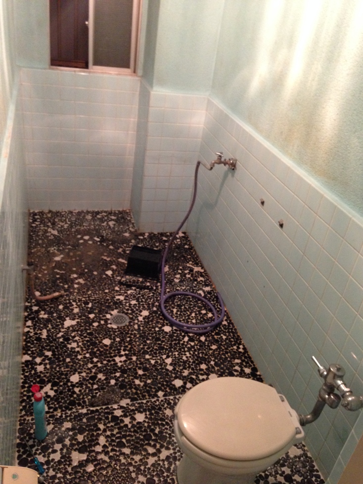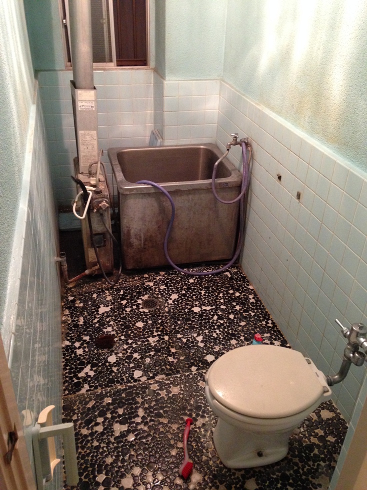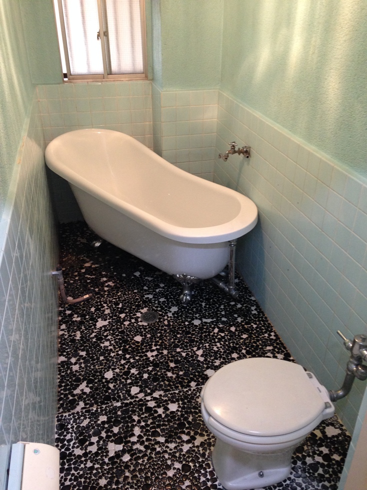 猫足バスタブの淵に置いてあるのは取り付ける予定の風呂用のTOTOの水栓が入っている箱です。現在付いている水栓は潰して反対側の壁にこのTOTOの水栓を取り付けてシャワーとバスタブへお湯が入れられるようにします。