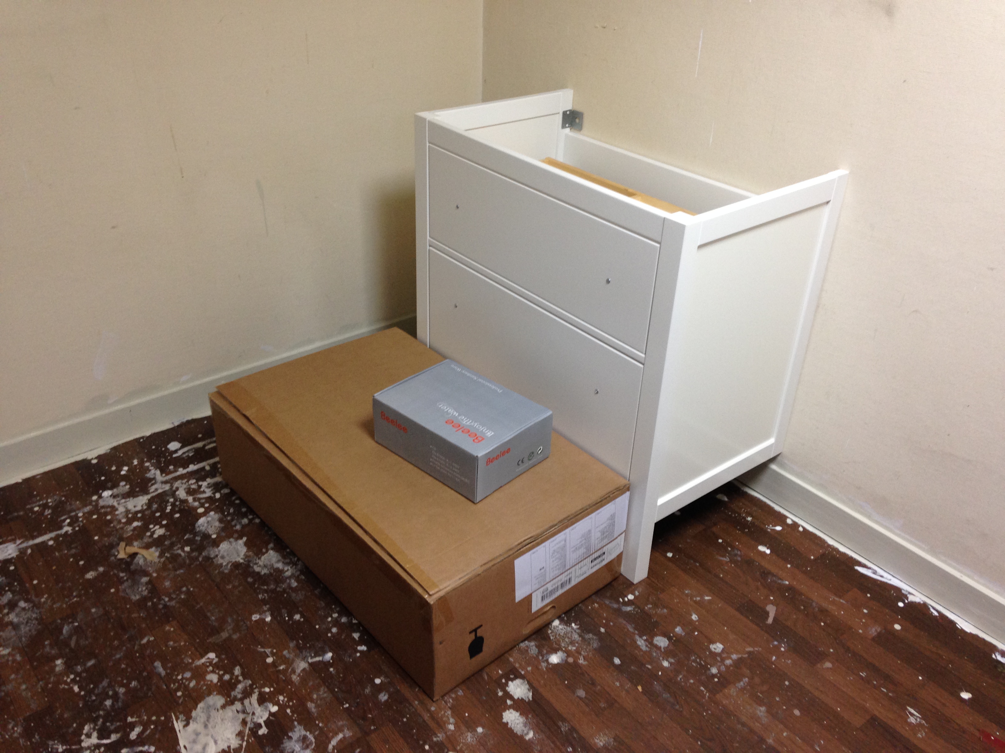 このIKEAの洗面台を取り付けます。幅は80cmです。シングルレバーのユニークな水栓です。洗面台の高さは90cmなのでかなり高めですが、洗面ボールの周りに小物をたくさん置けるので化粧等をする時にとても便利だと思います。
