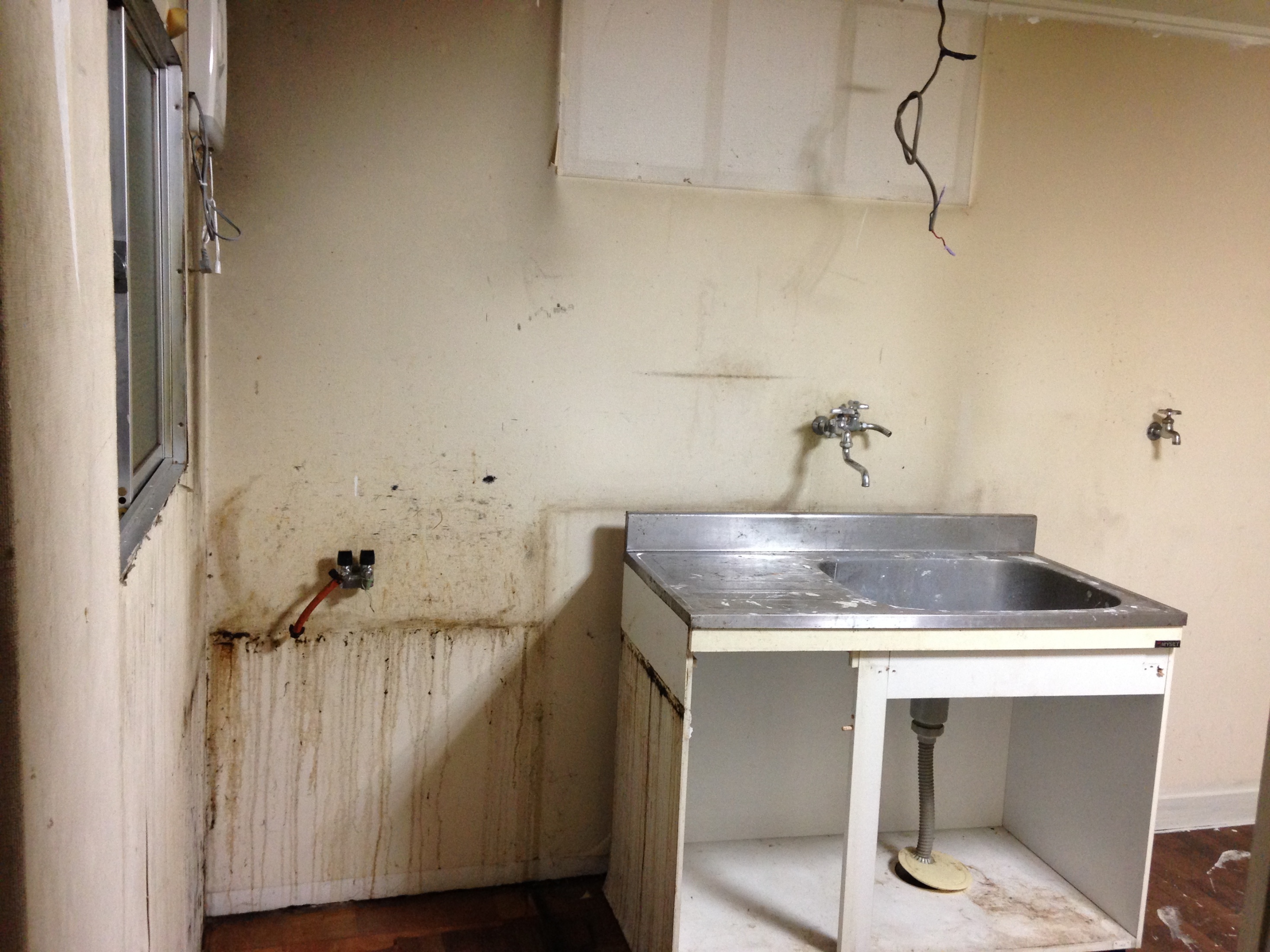 この洗面台ももちろん取り替えます。現在付いているのは幅が60cmのものです。お洒落ではないし、汚いのでこれと取り替えます。